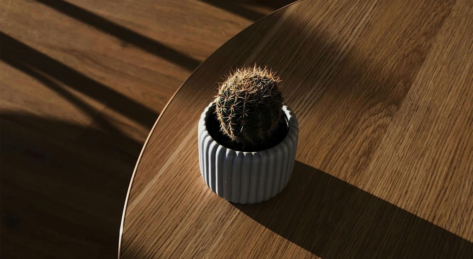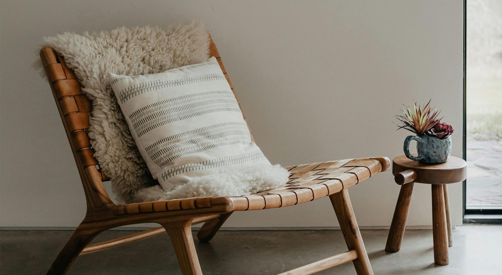 • swath of sunlight shines across a well made bed and bedside table with a vase of cotton plants
