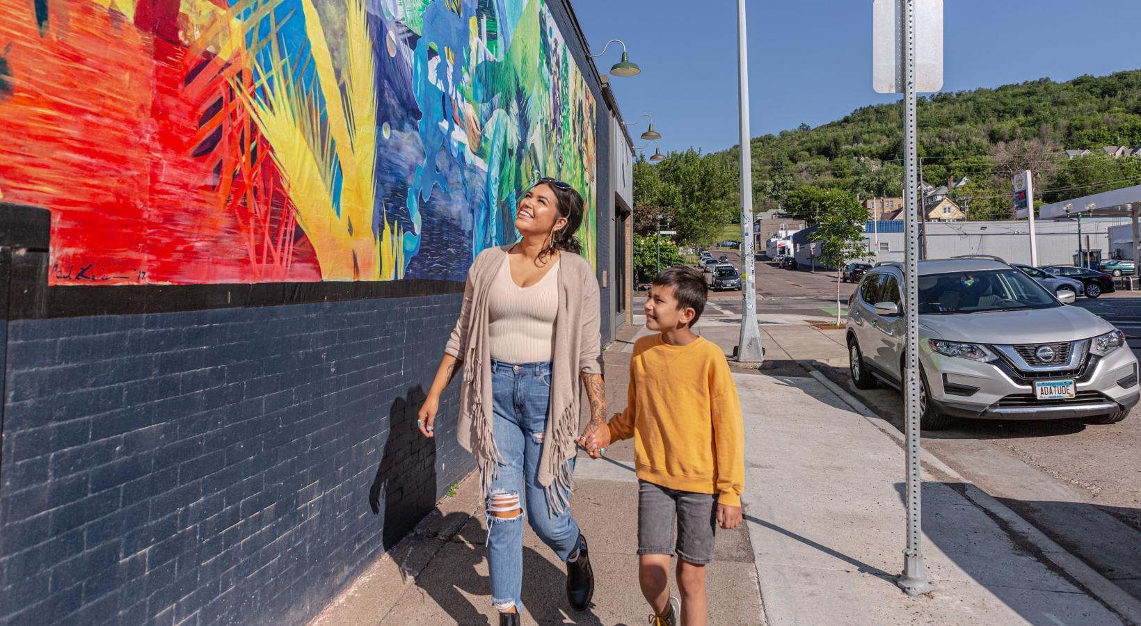 • a woman and a boy walking on a sidewalk next to a wall with graffiti